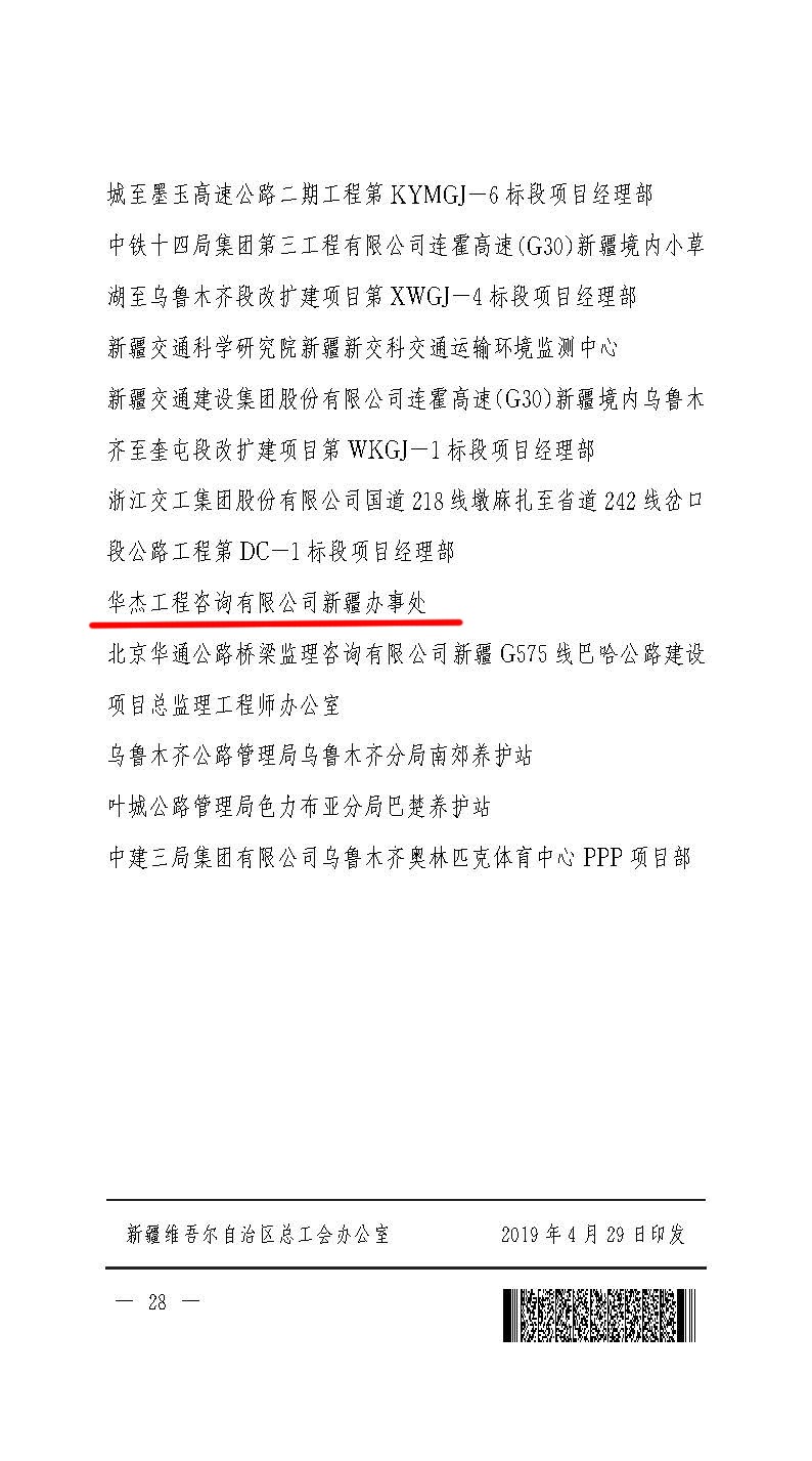 2019年4月29日,新疆維吾爾自治區(qū)總工會(huì)印發(fā)《關(guān)于表彰2019年開(kāi)發(fā)建設(shè)新疆獎(jiǎng)和自治區(qū)工人先鋒號(hào)的決定》,公司新疆辦事處獲評(píng)“工人先鋒號(hào)”榮譽(yù)稱(chēng)號(hào)。這是繼去年新疆辦事處榮獲自治區(qū)總工會(huì)、交通運(yùn)輸廳頒發(fā)的“絲路交通杯”優(yōu)秀組織單位后又一次獲得自治區(qū)頒發(fā)的集體榮譽(yù)。