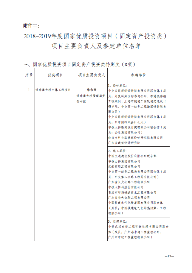2019年4月20日,中國投資協(xié)會印發(fā)了《關(guān)于表彰2018-2019年度國家優(yōu)質(zhì)投資項(xiàng)目的決定》(中投協(xié)[2019]1號),港珠澳大橋主體工程項(xiàng)目榮獲2018-2019年度國家優(yōu)質(zhì)投資項(xiàng)目特別獎(jiǎng),華杰公司作為該項(xiàng)目投資咨詢機(jī)構(gòu)獲得表彰。