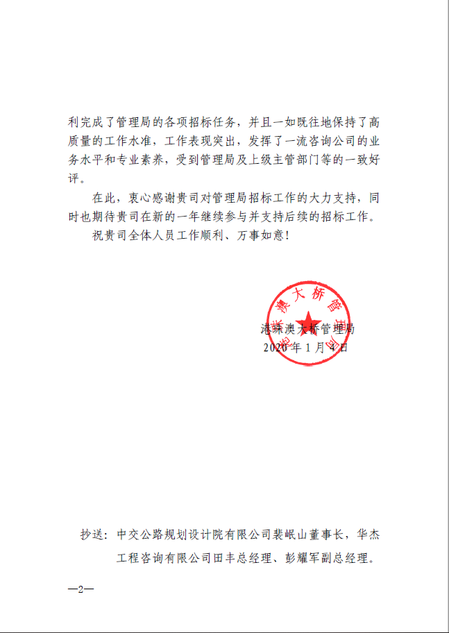 近日,公司收到業主單位港珠澳大橋管理局發來的感謝信。在港珠澳大橋主體工程建設期,公司提供了優質的項目管理和招標咨詢服務;大橋進入運營期后,公司繼續為大橋防洪影響后評估、東人工島旅游(藍海豚島)及配套設施開發總體策劃及概念設計、機電日常養護等項目提供了全過程的招標代理服務。華杰公司招標三部團隊以高度負責、銳意進取、求真務實的工作態度,一如既往地保持了高質量的工作水準,獲得了業主的表揚。