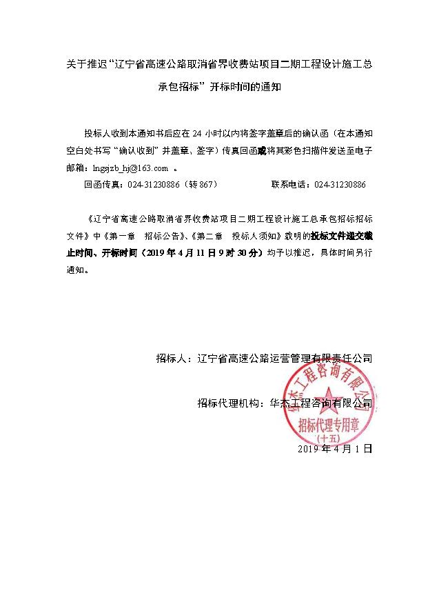 遼寧省高速公路取消省界收費站項目二期工程設計施工總承包招標——推遲開標時間的通知(2019-4-1)